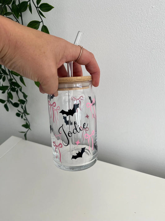 Personalised glass cup with straw, Libby cup, Halloween cup, Iced coffee glass, glass cup with bowsRegular price £10.00 GBPRegular priceUnit price / per-