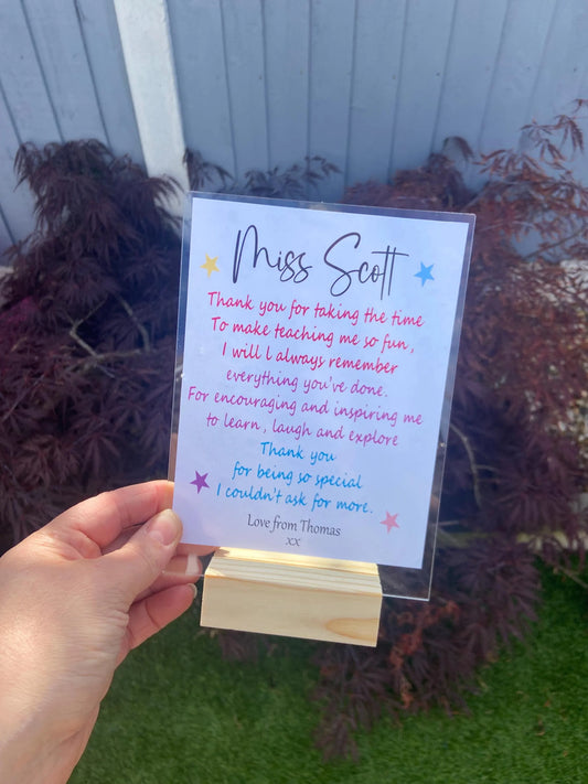 Thank You Gift, Personalised acrylic plaque, acrylic standing sign with wooden block. personalised gifts for teacher, Teacher PlaqueRegular price £15.00 GBPRegular priceUnit price / per-