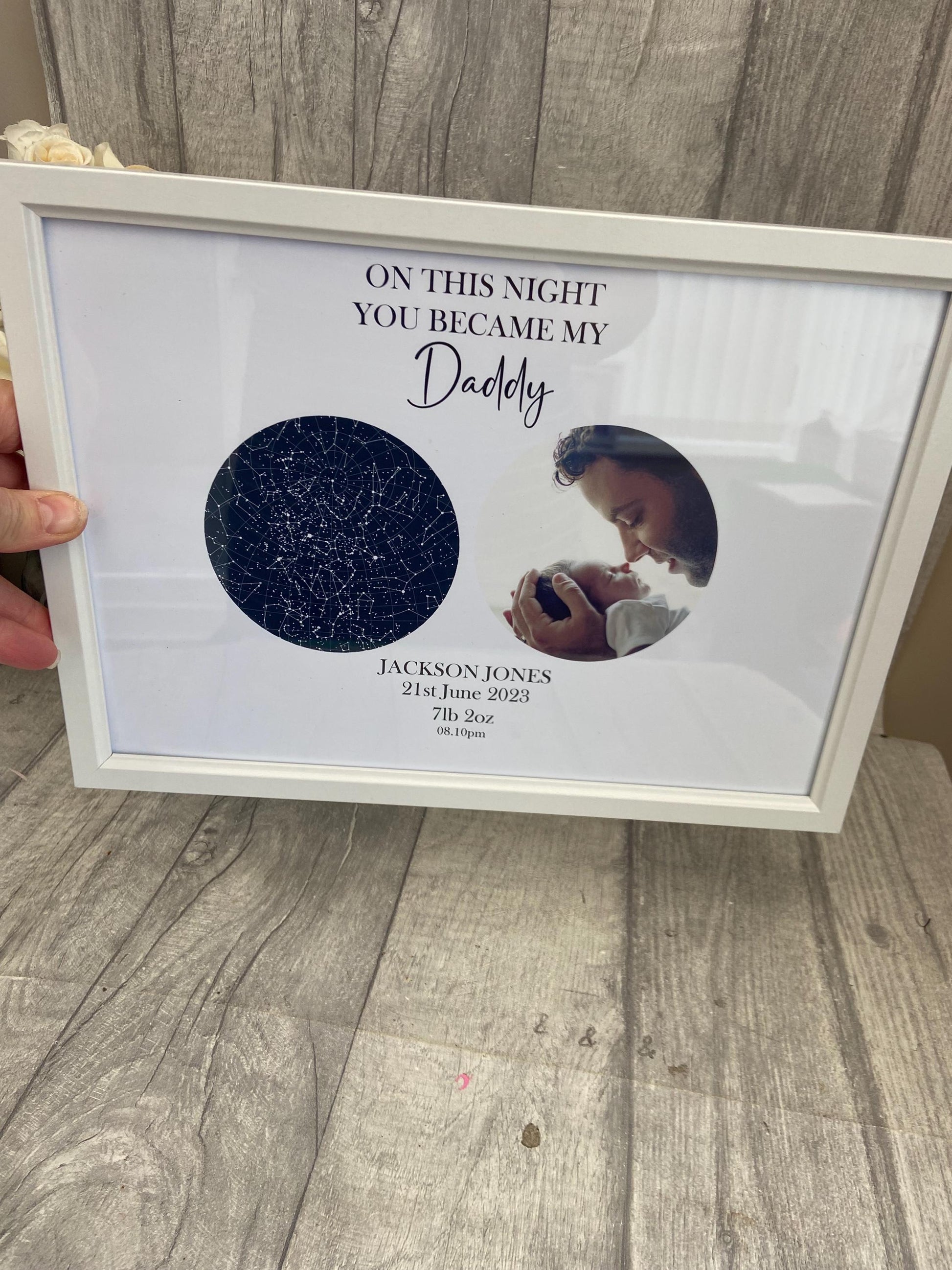 A beautiful custom  gift,  The stars on that special day the baby  was born along with your photo.