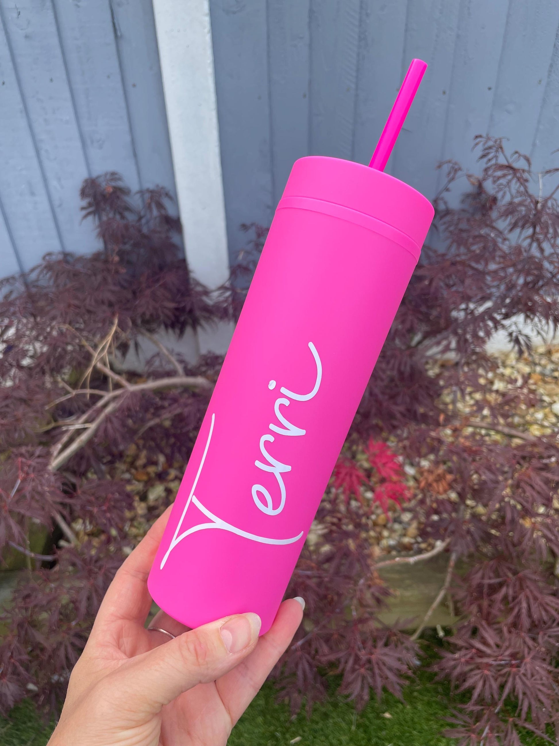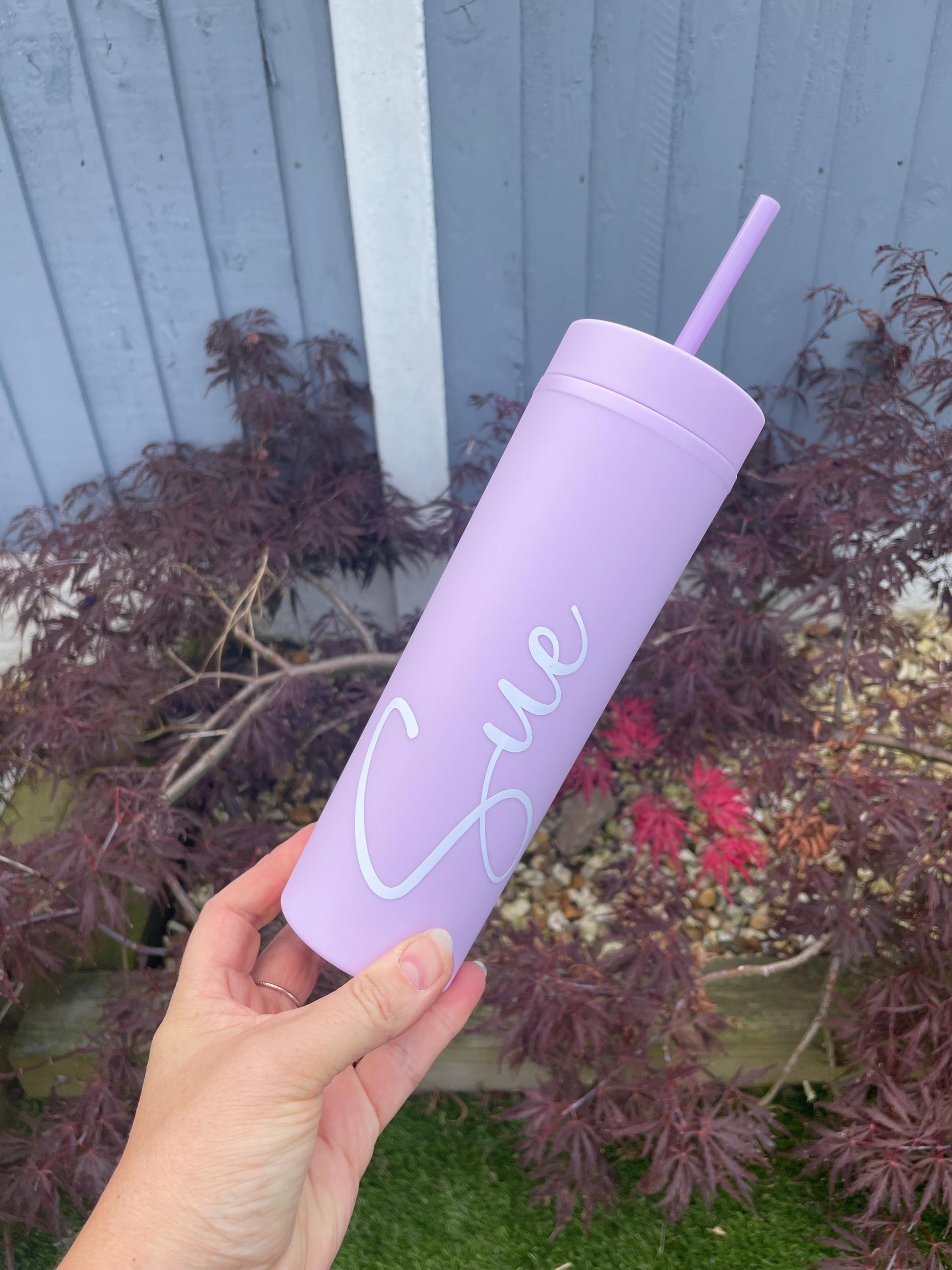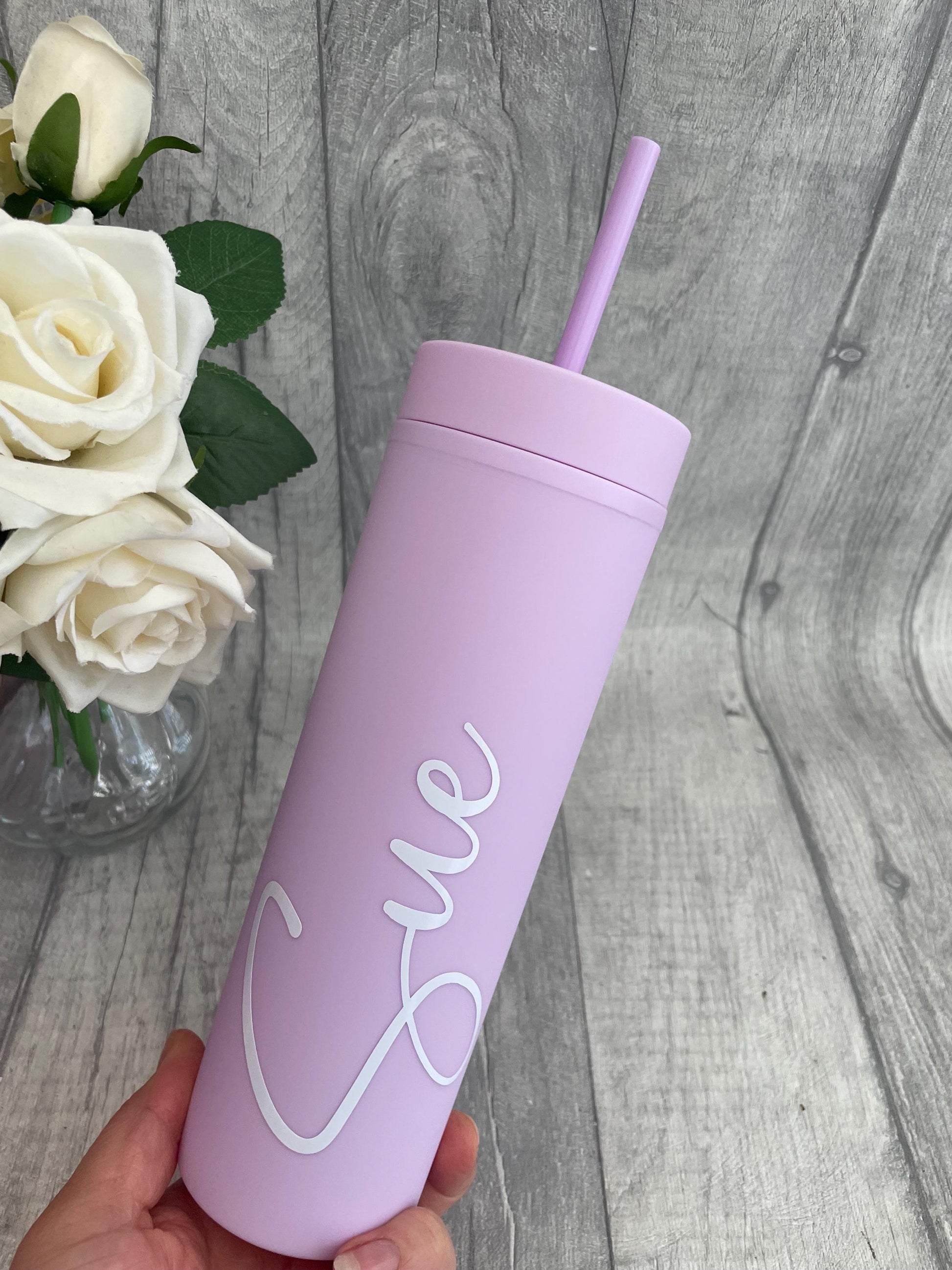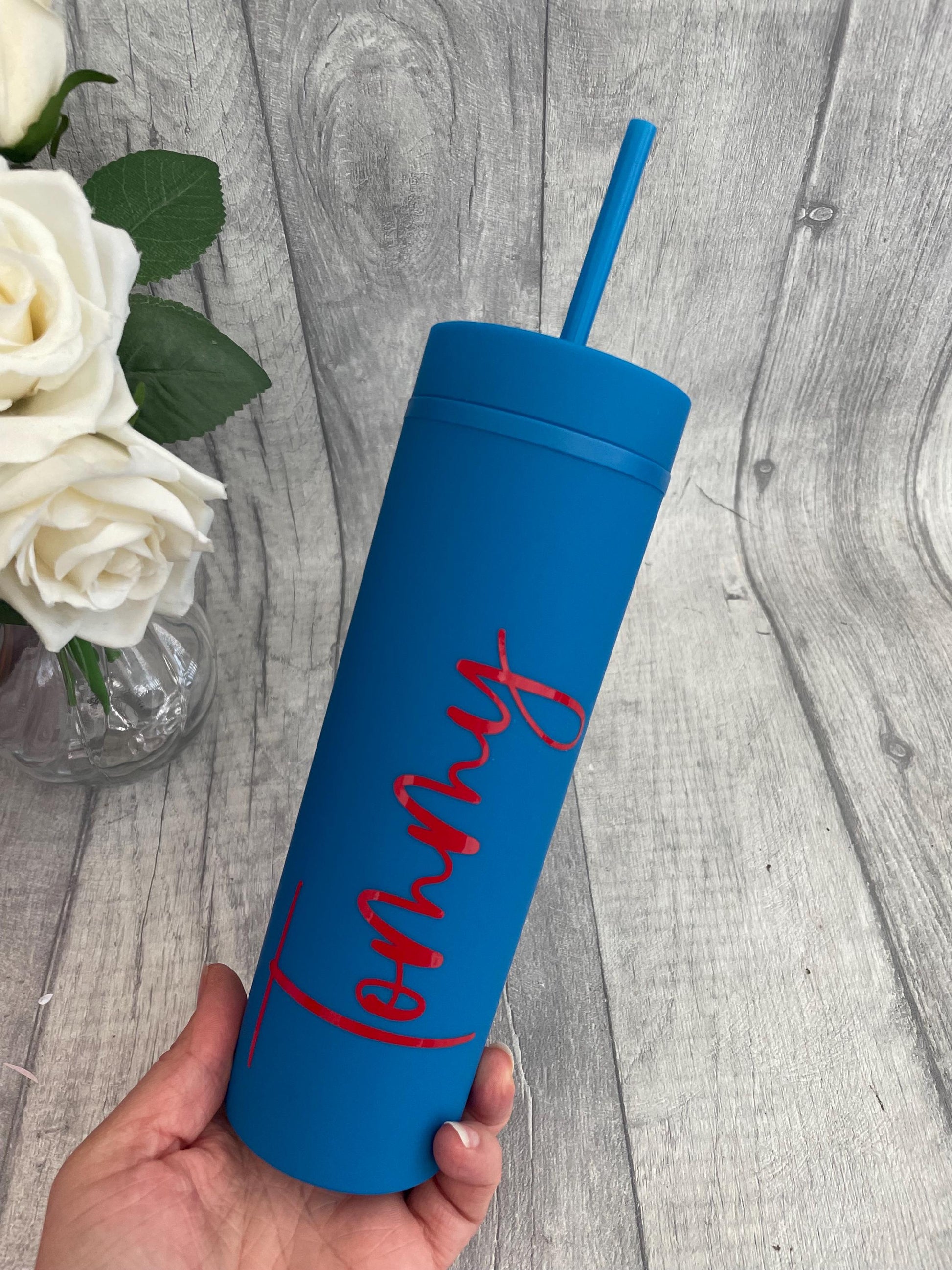 These 16oz skinny matte double walled tumbler features a personalised name name..