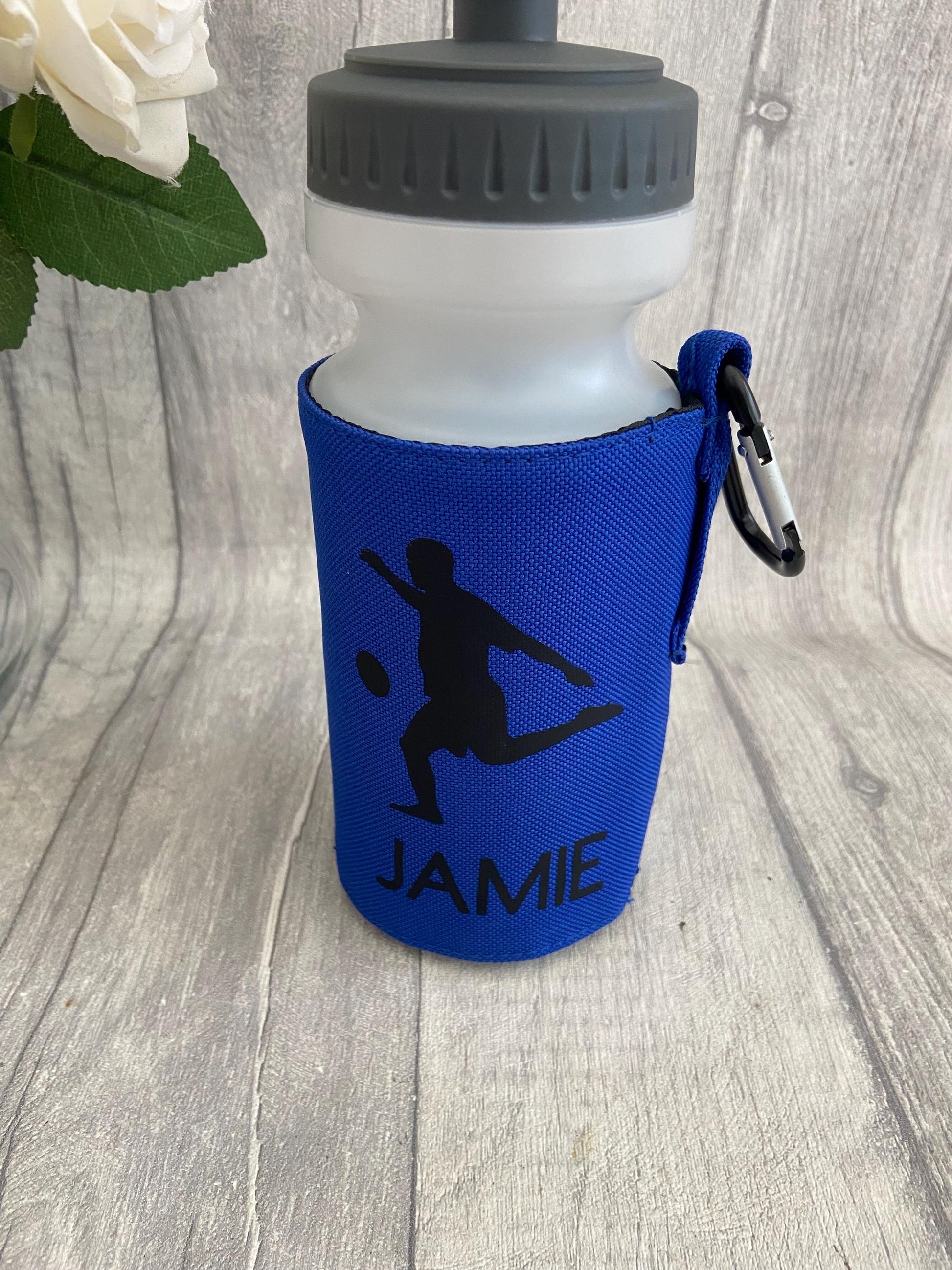 Personalised kids water bottle with holder.