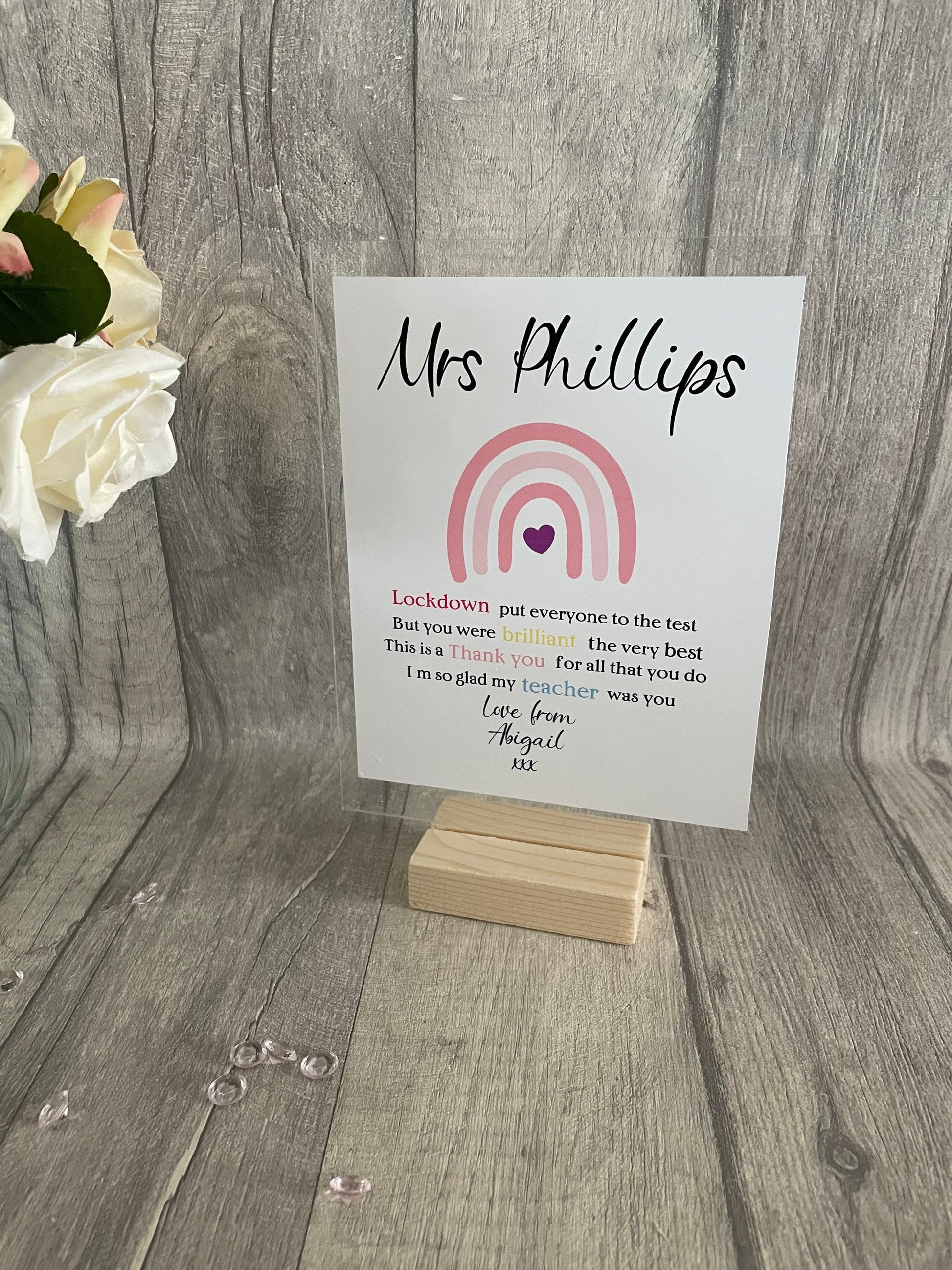 Thank You Gift, Personalised acrylic plaque, acrylic standing sign with wooden block. personalised gifts for teacher, Teacher Plaque