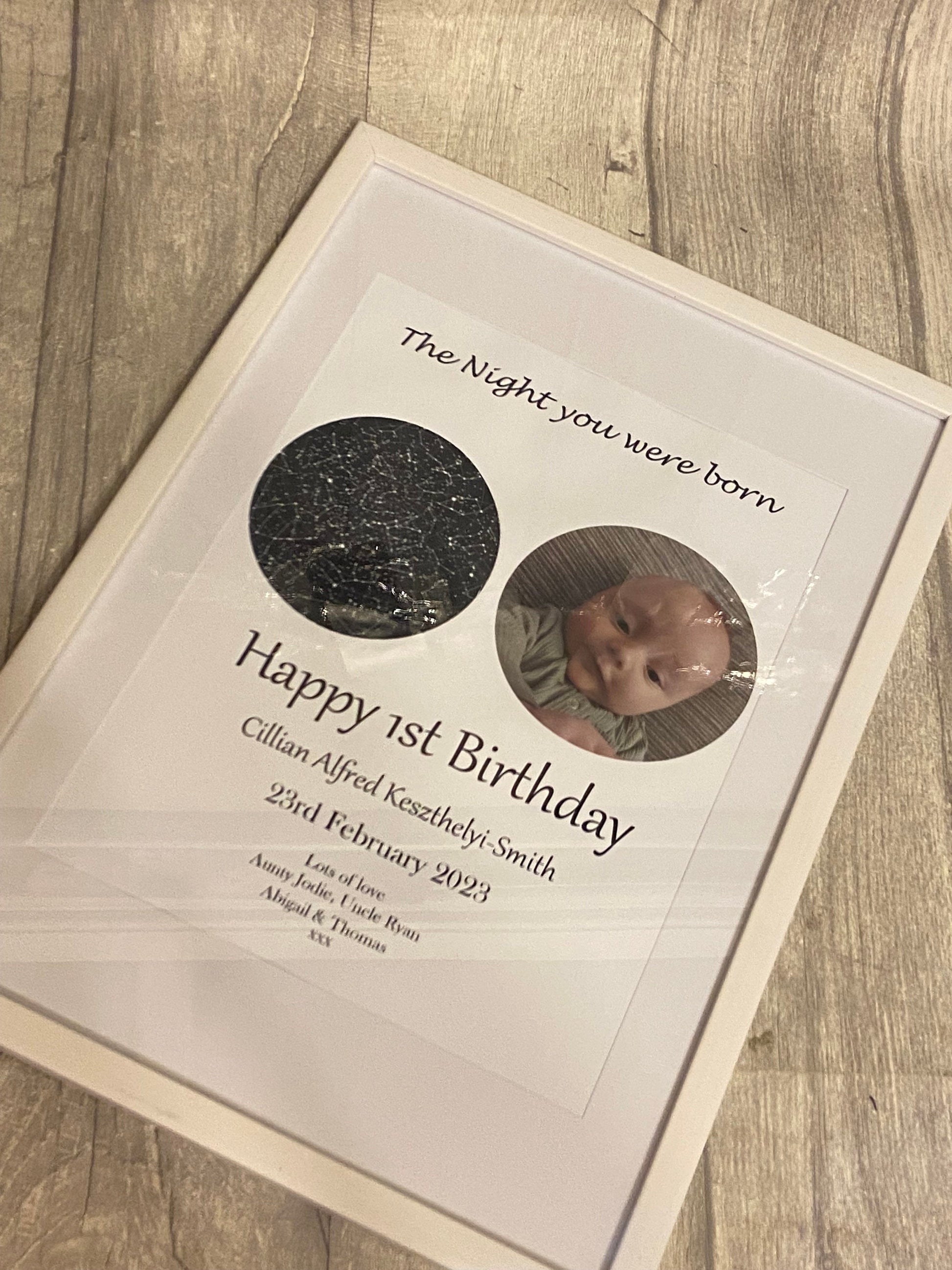 A beautiful custom new baby gift, The stars on that special day the baby was born along with your photo.